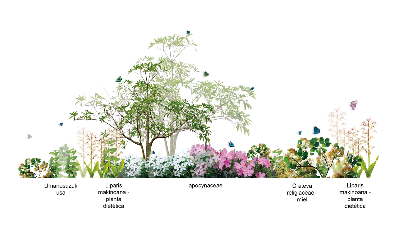 The proposal preserves the existing vegetation linked to the beach front and increases the green areas by reestablishing more of the local forest as a shelter for the visitors of the project. Within this green shelter starts the benefits on a physical and psychological level of our interaction with nature. As we get immerse in it, we become more aware of its importance, how it has impacted the life of the residents of Miyara and how this connection promotes a healthier relationship with the land, others and ourselves.